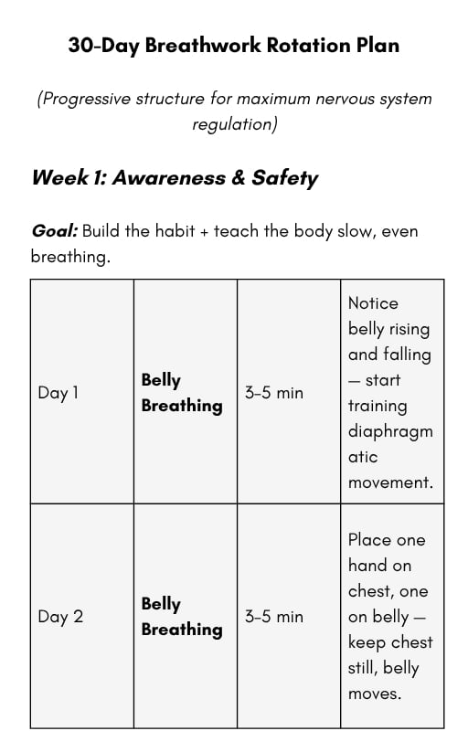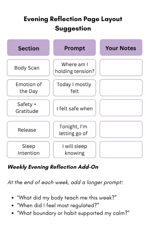 The final section helps you build your personal Nervous System Care Plan—a custom routine based on what your body responded to best during the month. This becomes your lifelong toolkit for staying regulated even in stressful environments.